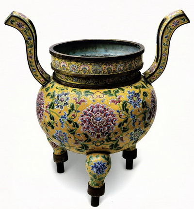 Yellow copolymer copper enamel censer with colored design of intertwined peonies,made during Emperor Yongzheng’s reign of the Qing Dynasty