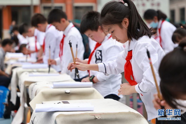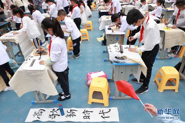 On May 19th, elementary school students are exhibiting calligraphy. Photo by Xinhua News Agency reporter Liu Xu