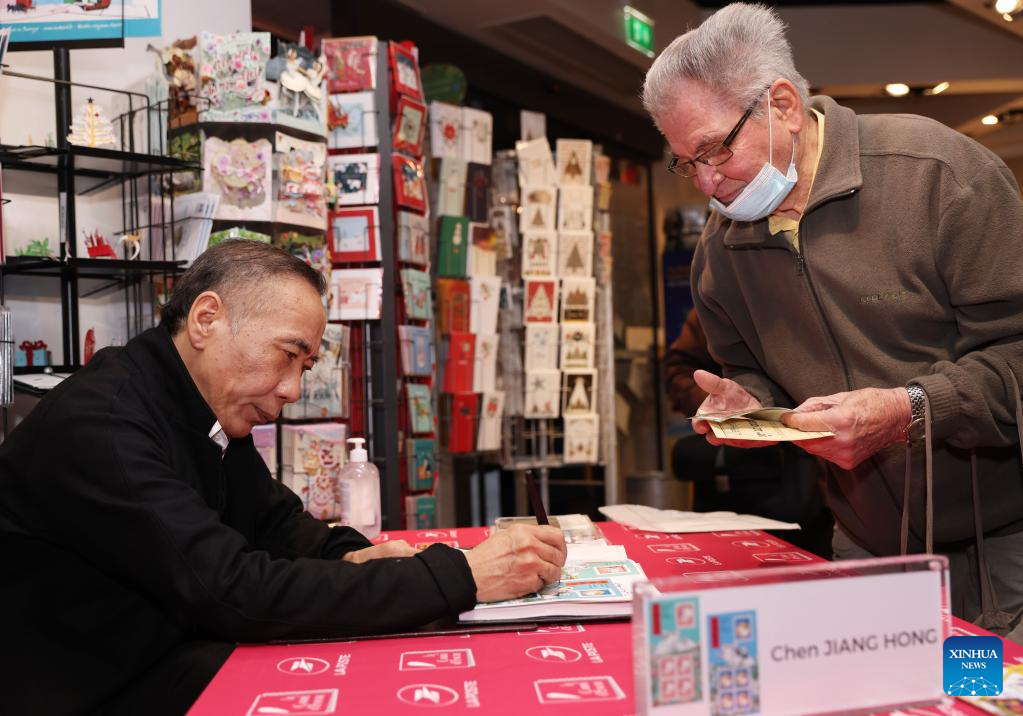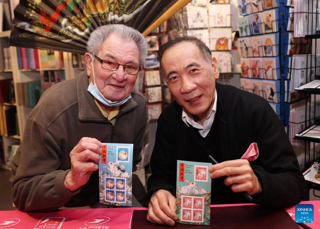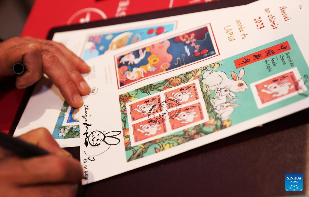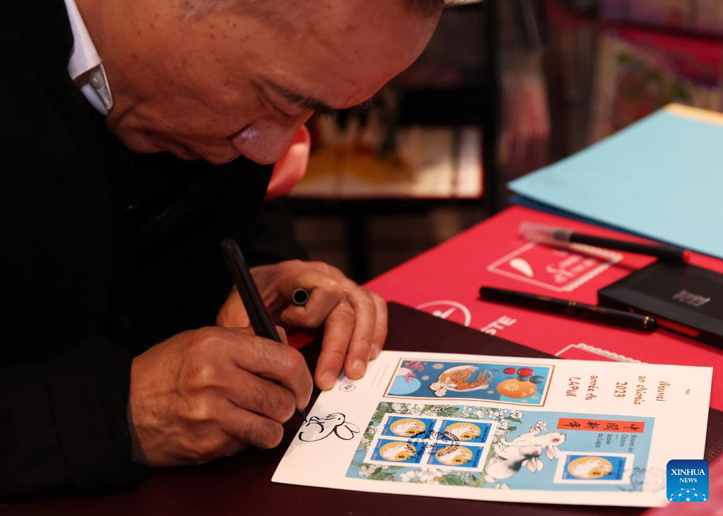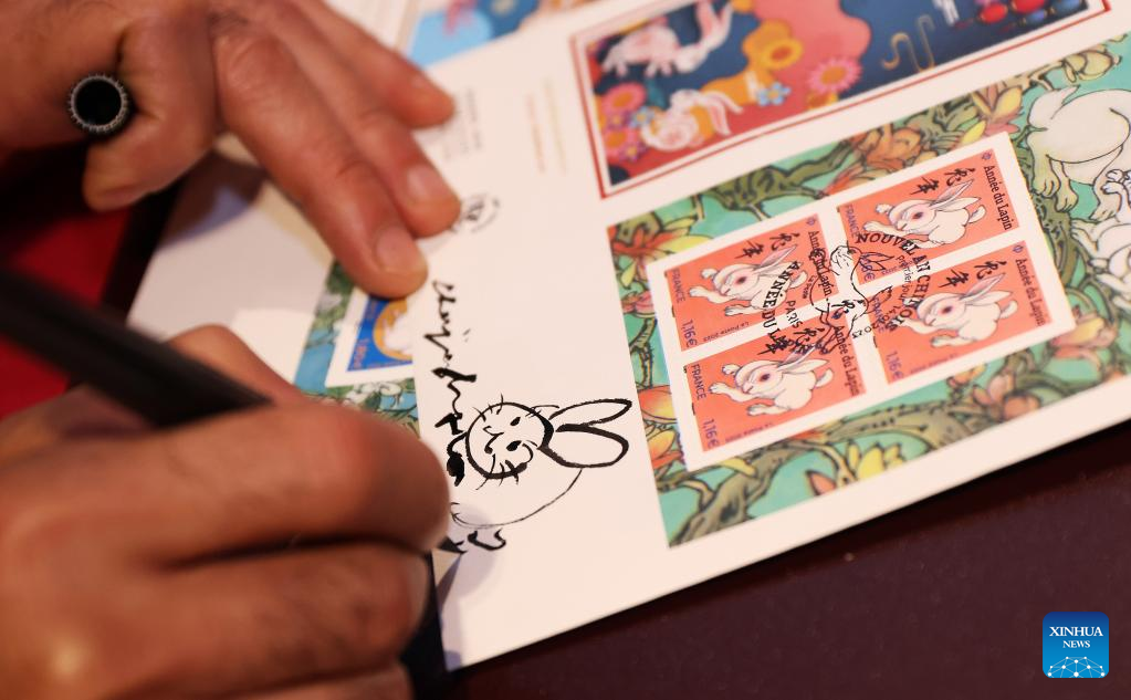 Chinese artist Chen Jianghong signs on the Year of the Rabbit commemorative stamps designed by him during a launching ceremony in Paris, France, Jan. 14, 2023.