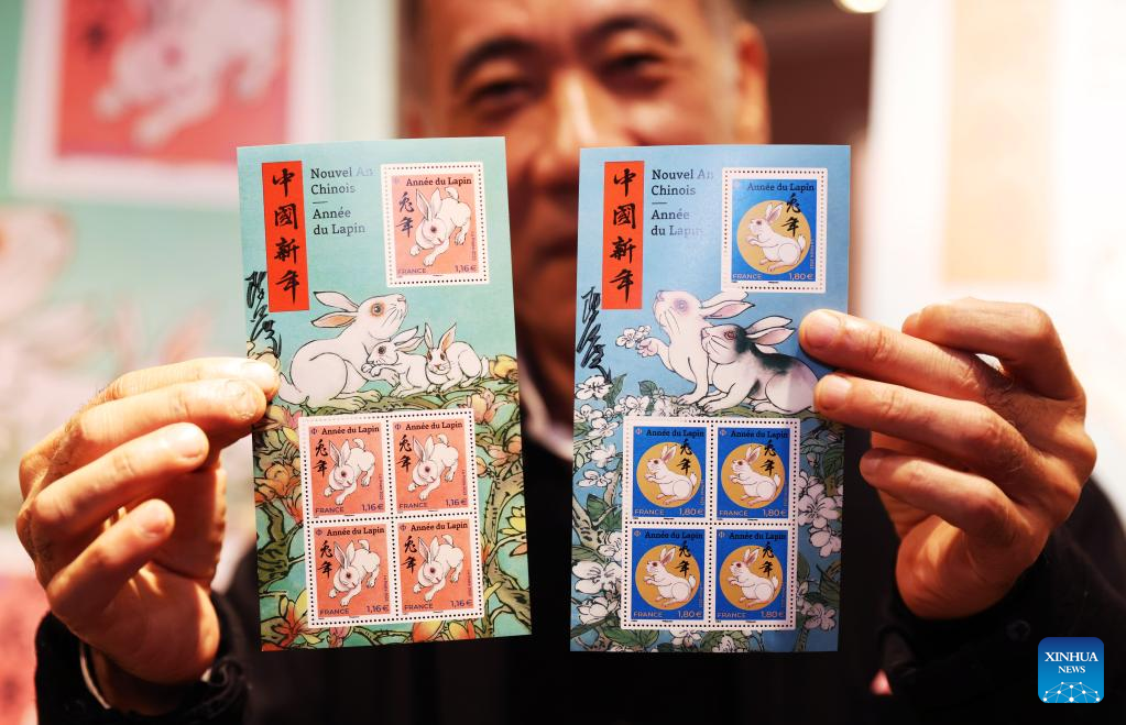 The Year of the Rabbit commemorative stamps, designed by Chinese artist Chen Jianghong, are seen during a launching ceremony in Paris, France, Jan. 14, 2023. (Xinhua/Gao Jing)