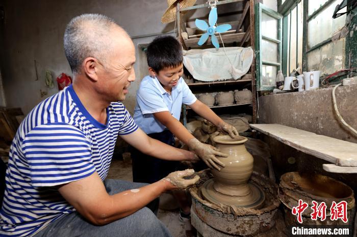 A pottery craft inheritor teaches a primary school student how to make a pottery product in Qicun township, Zaozhuang city, east China's Shandong Province. (Photo/Sun Zhongzhe)
