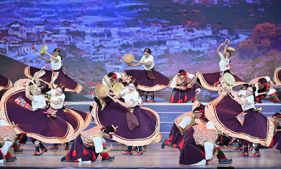 Artists dance at an opening gala of the sixth ethnic minority art festival in Beijing, capital of China, Aug. 31, 2021.(Xinhua/Li Xiang)