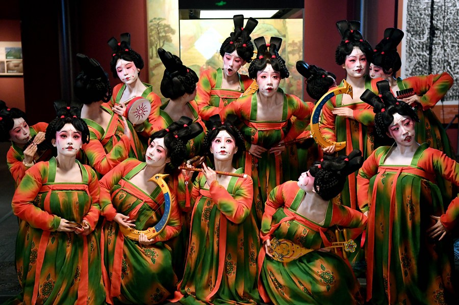 Dancers pose for photos during the recording of a program at Henan Museum in Zhengzhou, central China's Henan Province, Feb. 20, 2021.(Xinhua/Li An)
