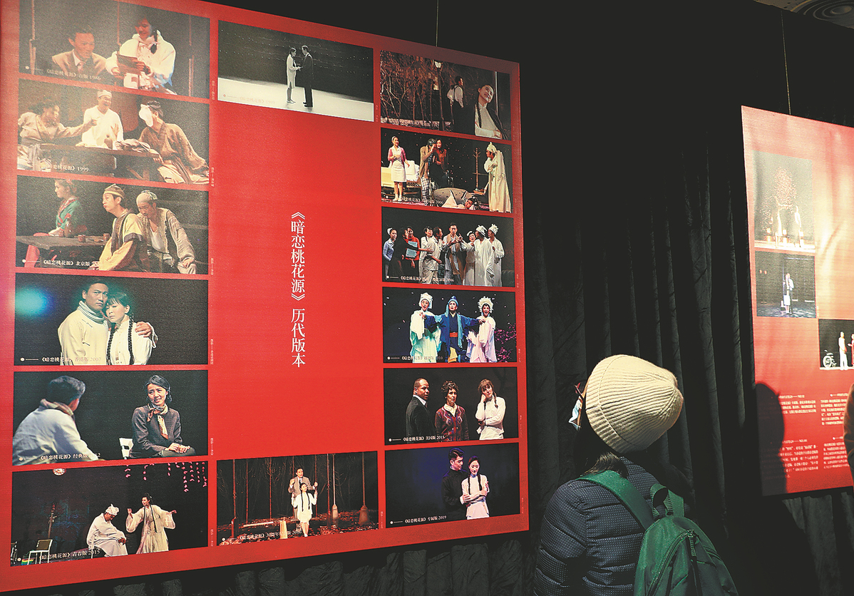 A visitor looks at photos from Stan Lai's classic play, Secret Love in Peach Blossom Land.[Photo provided to China Daily]
