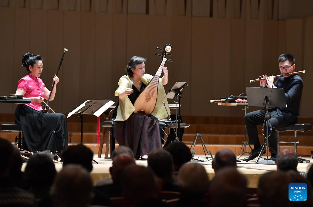 Zhang Zhenfang (L), Yang Jing (C) and Tan Qinglun perform with traditional Chinese musical instruments in St. Gallen, Switzerland, April 28, 2023. (Xinhua/Lian Yi)