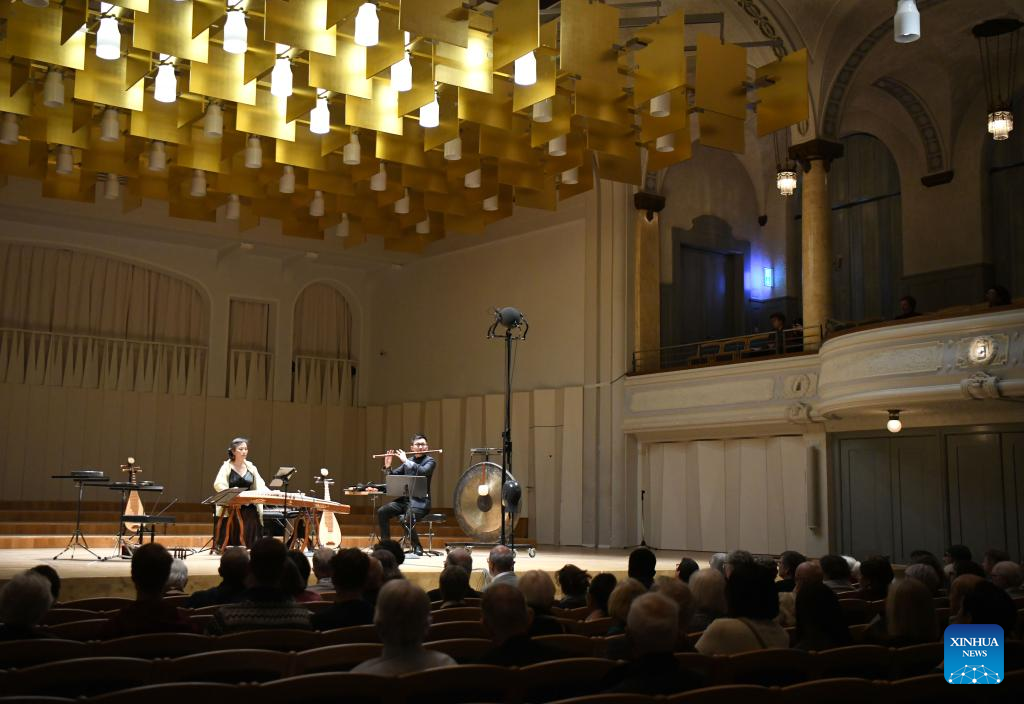 Yang Jing (L) and Tan Qinglun perform with traditional Chinese musical instruments in St. Gallen, Switzerland, April 28, 2023. (Xinhua/Lian Yi)