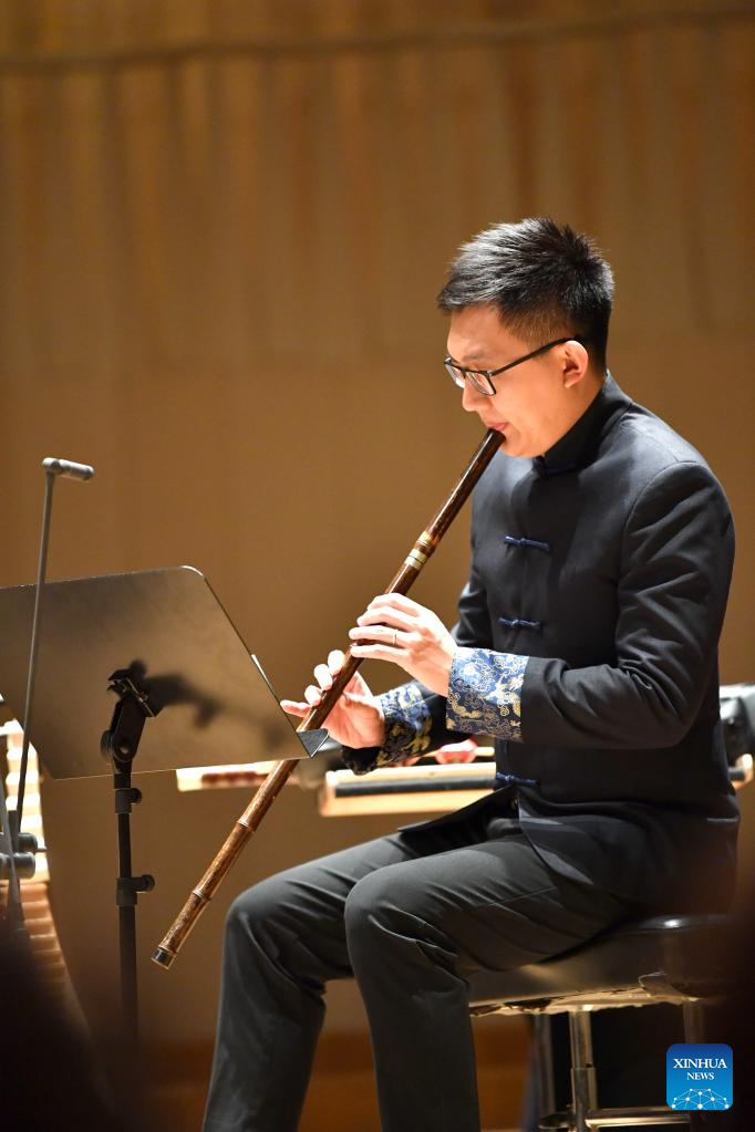 Tan Qinglun plays traditional Chinese musical instrument Xiao, a vertical bamboo flute, in St. Gallen, Switzerland, April 28, 2023. (Xinhua/Lian Yi)