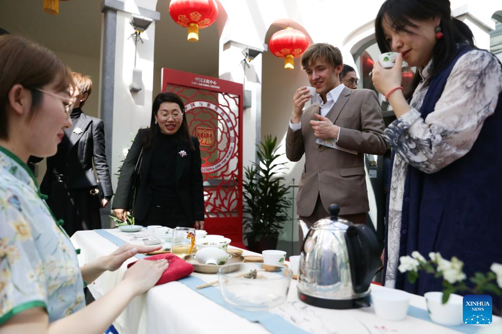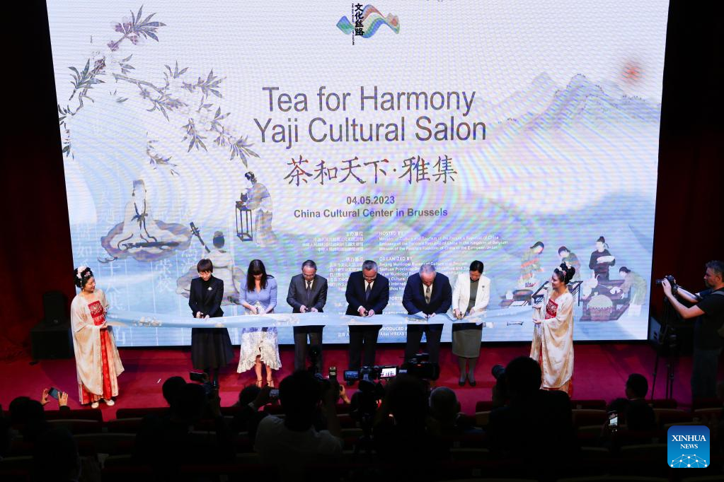 People taste tea during an opening ceremony of Yaji Cultural Salon "Tea for Harmony" at China Cultural Center in Brussels, Belgium, on May 4, 2023. (Xinhua/Zheng Huansong)