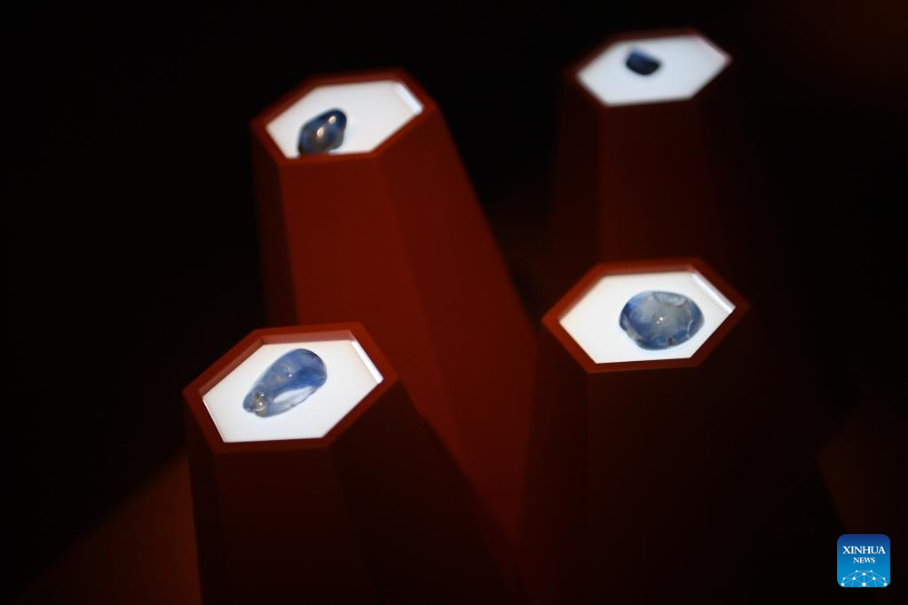 This photo taken on May 11, 2023 shows sapphires displayed at Shaanxi History Museum in Xi'an, northwest China's Shaanxi Province. (Xinhua/Li Yibo)