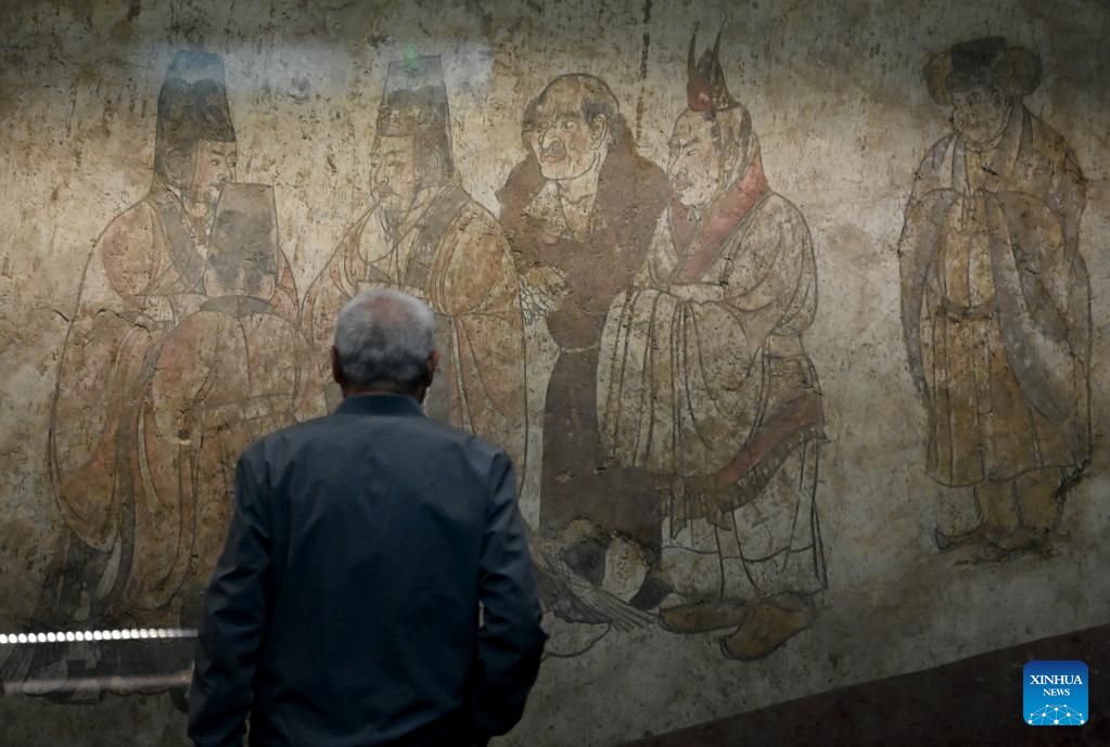 A visitor views a Tang Dynasty (618-907) mural depicting foreign envoys to China at Shaanxi History Museum in Xi'an, northwest China's Shaanxi Province, May 11, 2023. (Xinhua/Li Yibo)