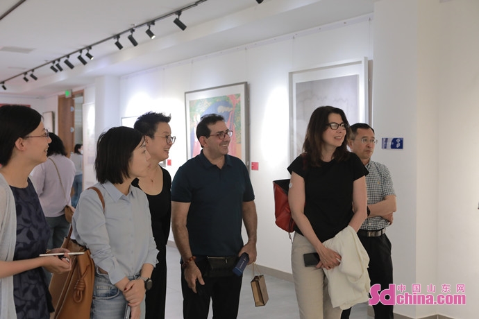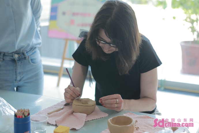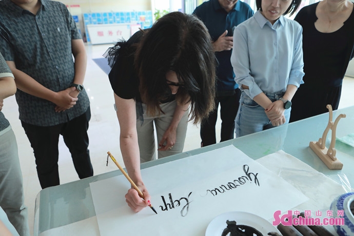 In the Dongying Art Museum, the delegation appreciated a Chinese Painting Creation Tour Exhibition of the Chinese National Academy of Arts, experienced the Yellow River clay tea cup kneading, and learned the creation process of Chinese painting and calligraphy.