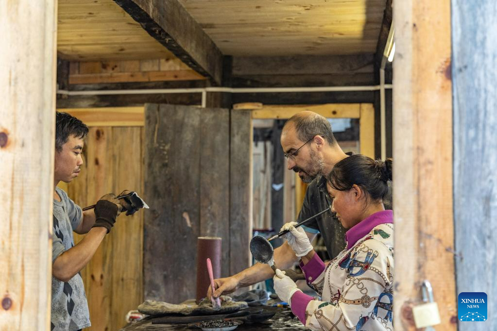 Vincent Cazeneuve and villagers lacquer the artworks at his studio in Songbai Village of Beiping Town, Chengkou County, southwest China's Chongqing Municipality, May 29, 2023. (Xinhua/Huang Wei)