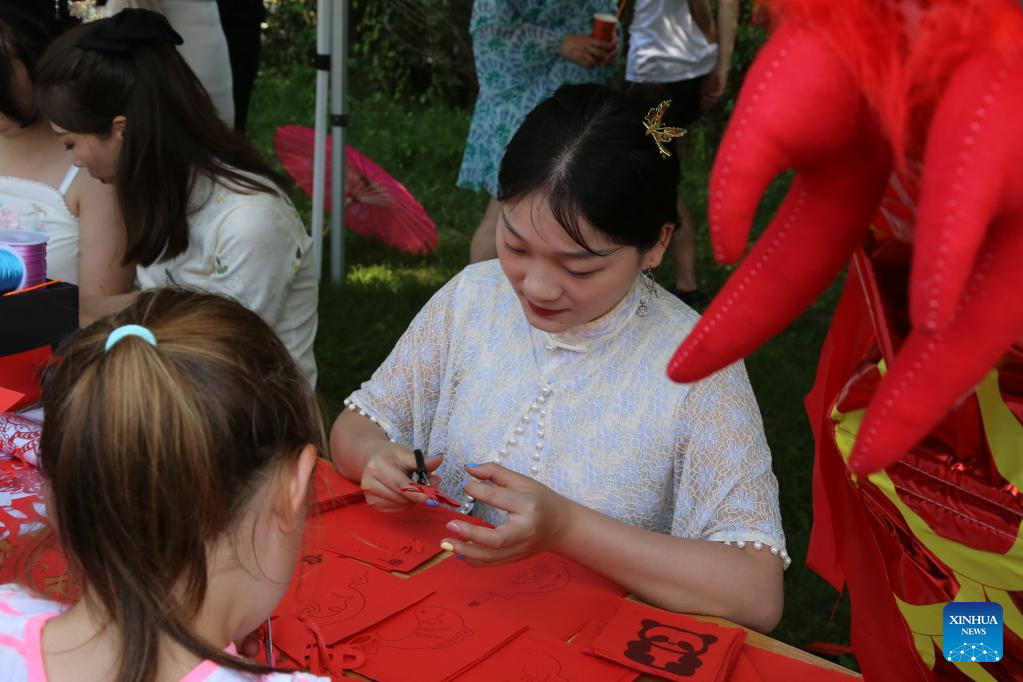 A staff member makes paper cutting works at a dragon boat cultural festival in Sofia, Bulgaria, June 24, 2023. Bulgaria's first dragon boat cultural festival kicked off at Pancharevo Lake in the capital city of Sofia on Saturday. (Xinhua/Lin Hao)