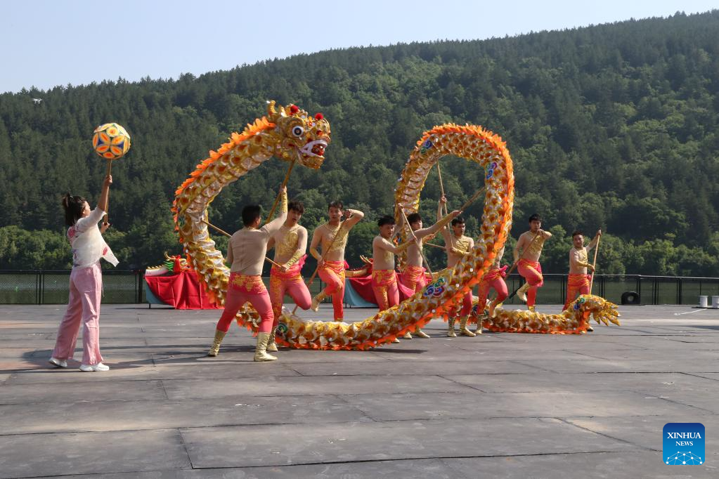 Actors perform dragon dance at a dragon boat cultural festival in Sofia, Bulgaria, June 24, 2023. Bulgaria's first dragon boat cultural festival kicked off at Pancharevo Lake in the capital city of Sofia on Saturday. (Xinhua/Lin Hao)