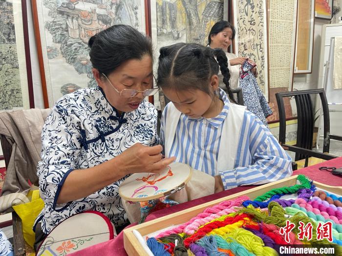 A cross-stitch embroidery artist teaches techniques to a child. (Photo courtesy of Ding Ru)