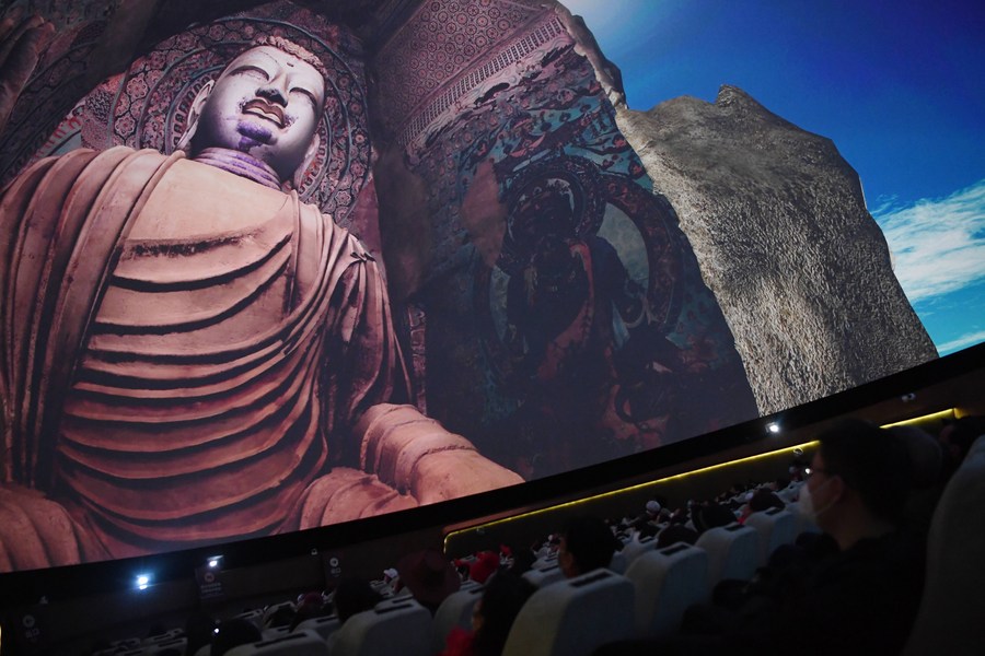 People watch a fulldome digital film at a digital center in Dunhuang, northwest China's Gansu Province, March 14, 2023. (Xinhua/Chen Bin)