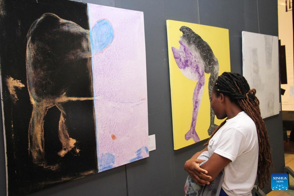 A visitor watches art works exhibited during the exhibition of works of young Chinese and Beninese artists at the Chinese Cultural Center in Cotonou, Benin, Nov. 25, 2023. An exhibition featuring works by 11 Beninese and Chinese artists opened here Saturday evening, aiming to celebrate booming cultural exchanges between the two countries' young artists. (Photo by Seraphin Zounyekpe/Xinhua)