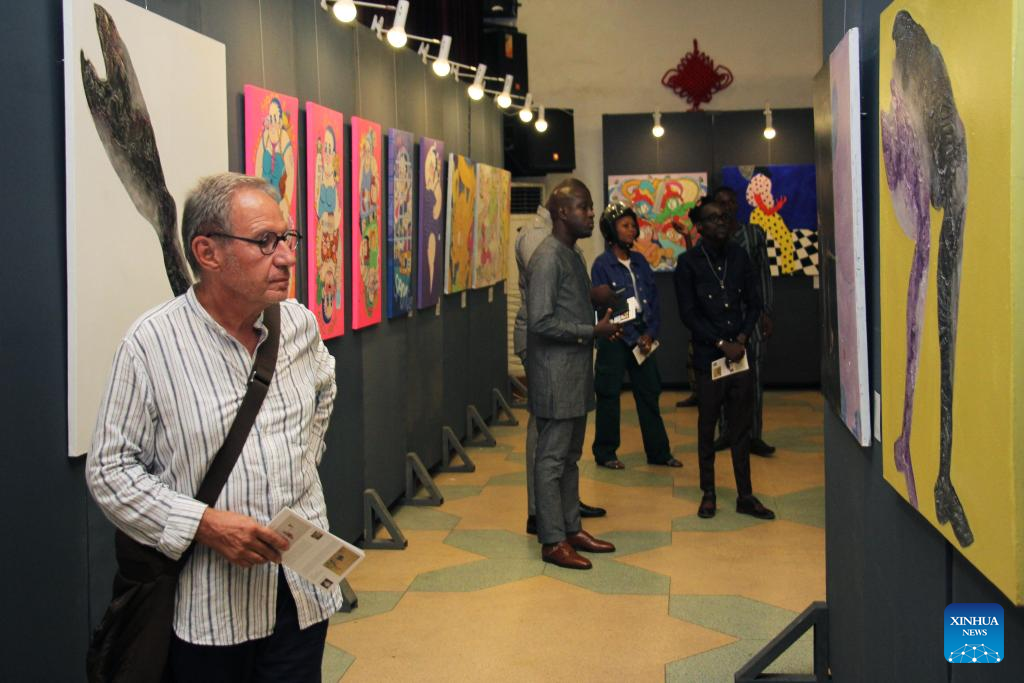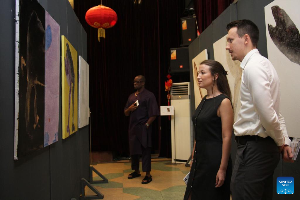 Visitors watch art works exhibited during the exhibition of works of young Chinese and Beninese artists at the Chinese Cultural Center in Cotonou, Benin, Nov. 25, 2023. An exhibition featuring works by 11 Beninese and Chinese artists opened here Saturday evening, aiming to celebrate booming cultural exchanges between the two countries' young artists. (Photo by Seraphin Zounyekpe/Xinhua)