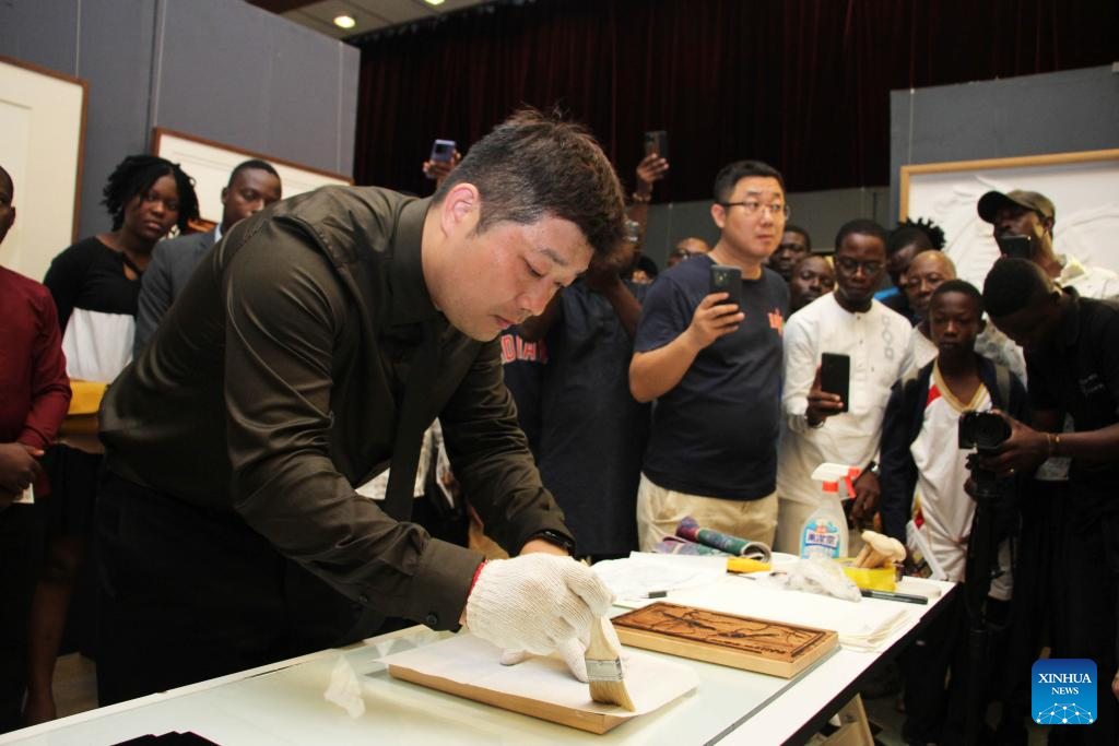 Chinese artist Wang Guanzhou makes works during the exhibition of works of young Chinese and Beninese artists at the Chinese Cultural Center in Cotonou, Benin, Nov. 25, 2023. An exhibition featuring works by 11 Beninese and Chinese artists opened here Saturday evening, aiming to celebrate booming cultural exchanges between the two countries' young artists. (Photo by Seraphin Zounyekpe/Xinhua)