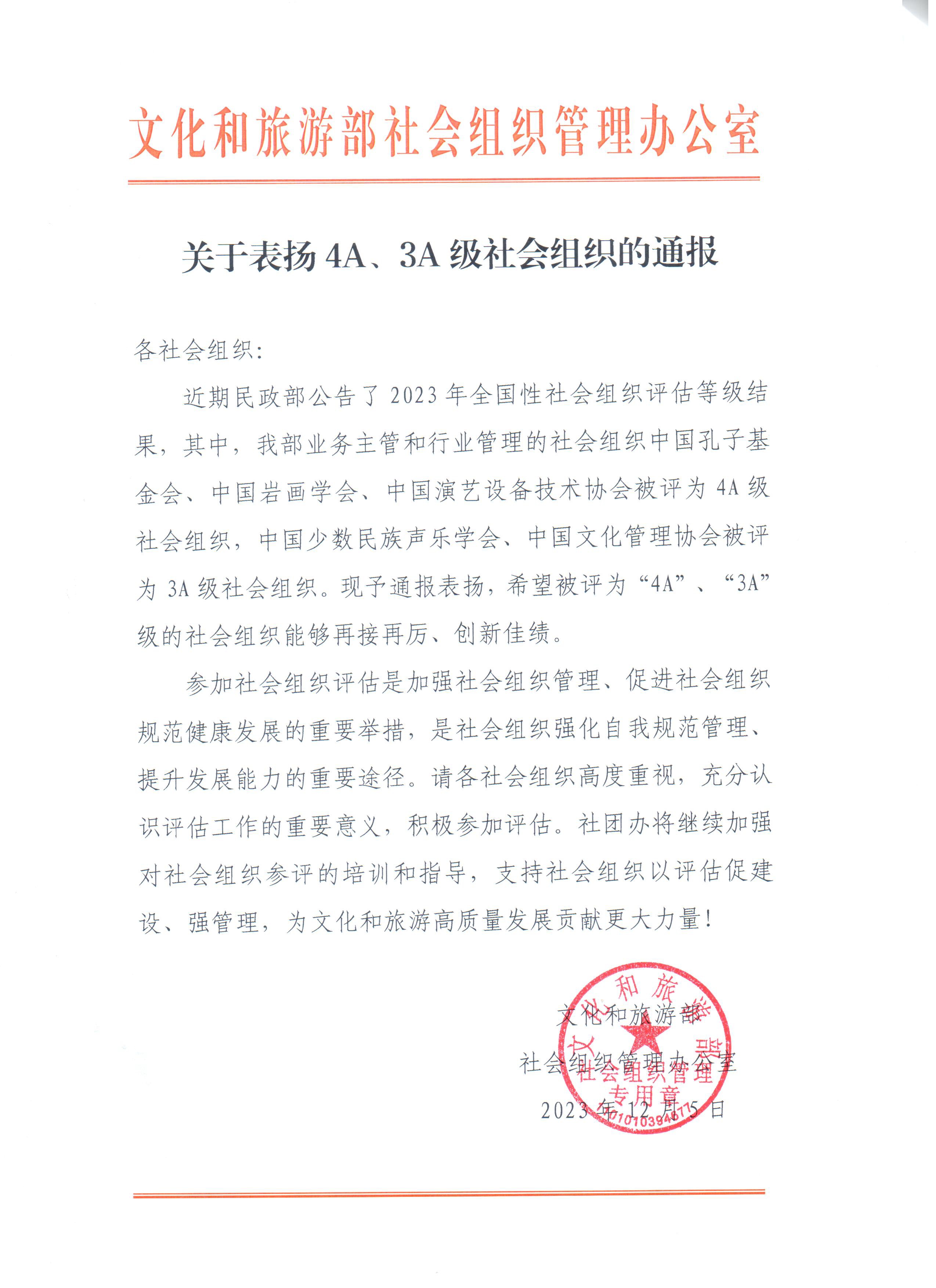 Recently, the Ministry of Civil Affairs announced the outcome of 2023 national evaluation of social organizations, among which the China Confucius Foundation was rated as a 4A-level foundation. The Ministry of Culture and Tourism commended the China Confucius Foundationinthe Circular on the Praise of 4A and 3A Social Organizations.