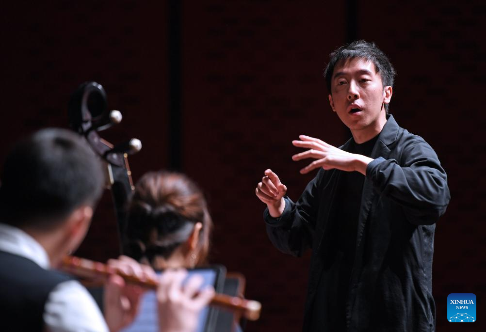 Kam Shing-hei, the artistic coordinator and composer-in-residence of the Hong Kong Gaudeamus Dunhuang Ensemble, conducts the orchestra during the opening of the "Hong Kong Palace Performing Showtime Carnival" in Hong Kong, south China, Nov. 26, 2023. (Xinhua/Chen Duo)