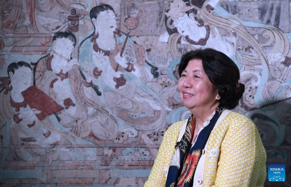 Leonie Ki, the honorary director and founder of the Hong Kong Gaudeamus Dunhuang Ensemble, receives an interview with Xinhua in Hong Kong, south China, Dec. 16, 2023. (Xinhua/Chen Duo)