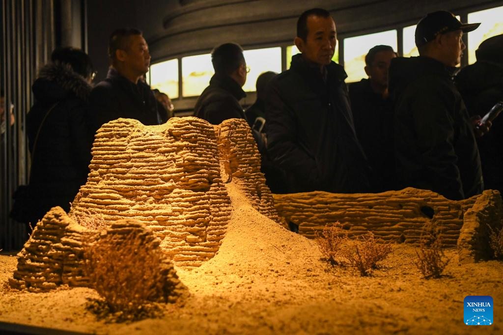 Tourists view the model of a beacon tower at the Silk Road and Great Wall Culture Museum in Yuli County, northwest China's Xinjiang Uygur Autonomous Region, Dec. 29, 2023.