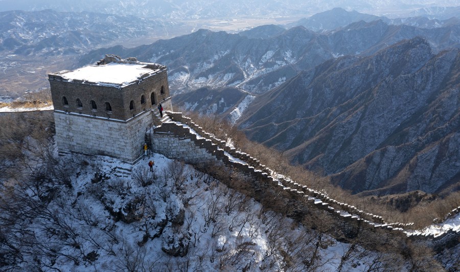 This aerial photo taken on Feb. 13, 2023 shows snow scenery of the Jiankou section of the Great Wall in Beijing, capital of China. (Xinhua/Cai Yang)