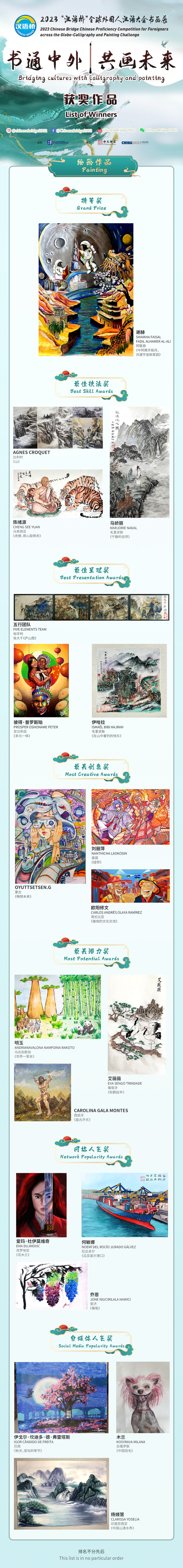 The 2023 Chinese Bridge Calligraphy and Painting Contest lasted for six months and attracted 1,084 contestants from 86 countries with a total of 1,146 calligraphy and painting works.