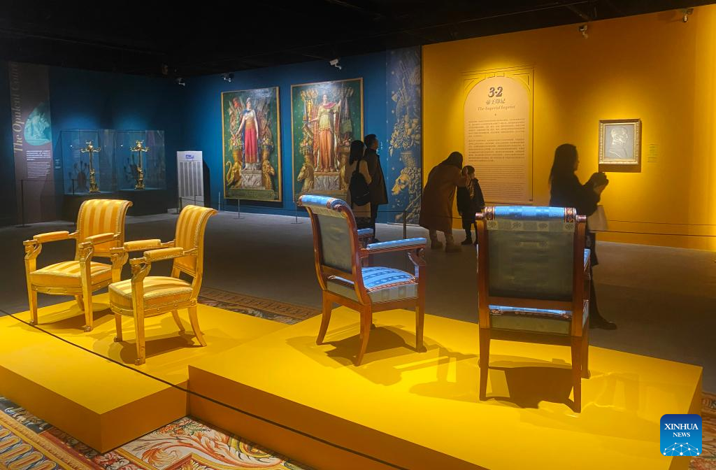 This photo taken with a mobile phone shows people visiting the exhibition titled "Meet Napoleon: The Disappeared Palaces" at the Meet You Museum in Beijing, capital of China, March 29, 2024. An exhibition consisting of valuable artifacts from the residences of Napoleon Bonaparte debuted in Beijing on Friday, as one of the activities to mark the 60th anniversary of the establishment of diplomatic relations between China and France. (Xinhua/Luo Xin)