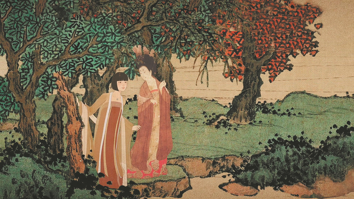 China Daily's digital employee Yuanxi (left) travels into the digital version of the book project A Comprehensive Collection of Ancient Chinese Paintings. She and a noblewoman from the classic figure painting, Court Ladies Wearing Floral Headdresses, enjoy the beauty of nature in a landscape painting. A SCREENSHOT FROM A CHINA DAILY VIDEO