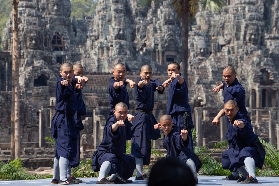China's Shaolin Kung Fu martial artists and Cambodian Bokator martial artists on Wednesday jointly performed "When Shaolin Meets Bokator" at the famed Angkor Archaeological Park, attracting crowds of spectators.