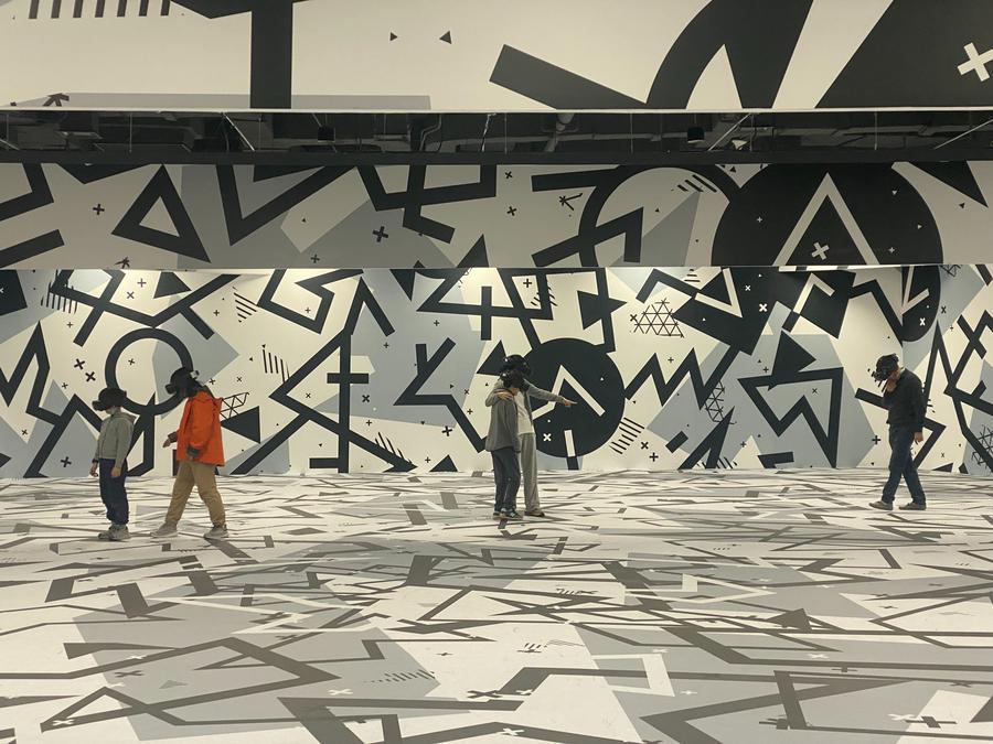 This photo taken with a mobile phone on April 17, 2024 shows people enjoying a Virtual Reality (VR) immersive experience exhibition featuring the Egyptian pyramids at the Phoenix Center in Beijing, capital of China. (Xinhua/Luo Xin)