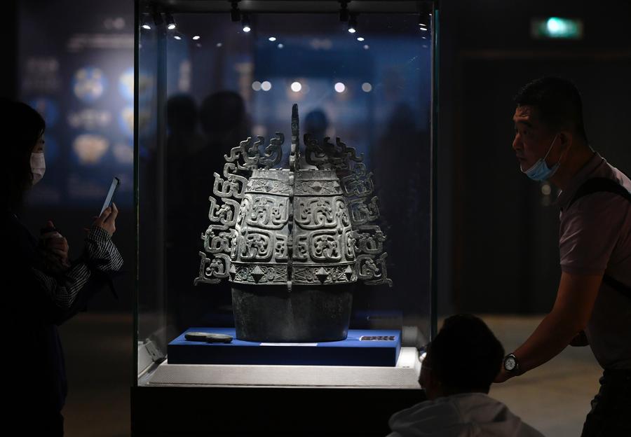People view Qin Gong Bo from Baoji Bronze Ware Museum at Fujian Museum in Fuzhou, southeast China's Fujian Province, May 12, 2022. (Xinhua/Wei Peiquan)