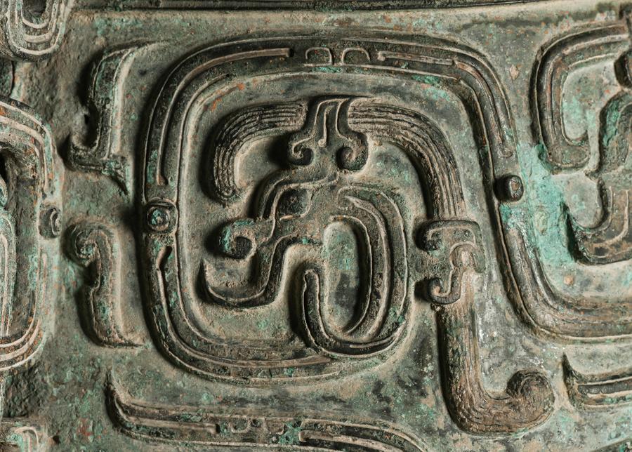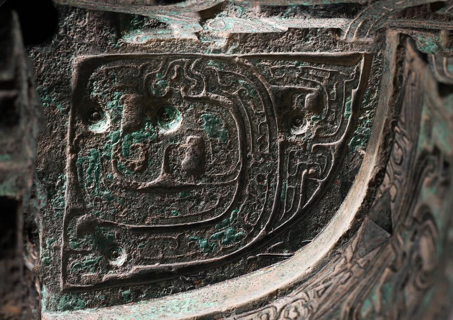 This photo taken on Jan. 23, 2024 shows the pattern of dragon on a piece of Qin Gong Bo at Baoji Bronze Ware Museum in Baoji, northwest China's Shaanxi Province. (Xinhua/Li He)