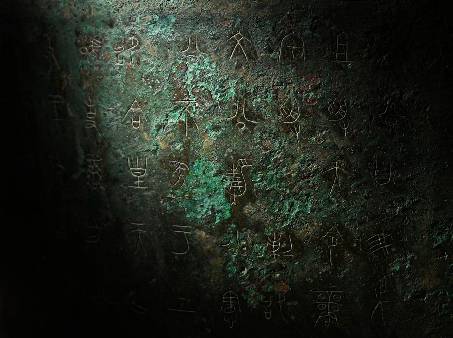 This photo taken on Jan. 23, 2024 shows part of the inscription on a piece of Qin Gong Bo at Baoji Bronze Ware Museum in Baoji, northwest China's Shaanxi Province. (Xinhua/Zou Jingyi)