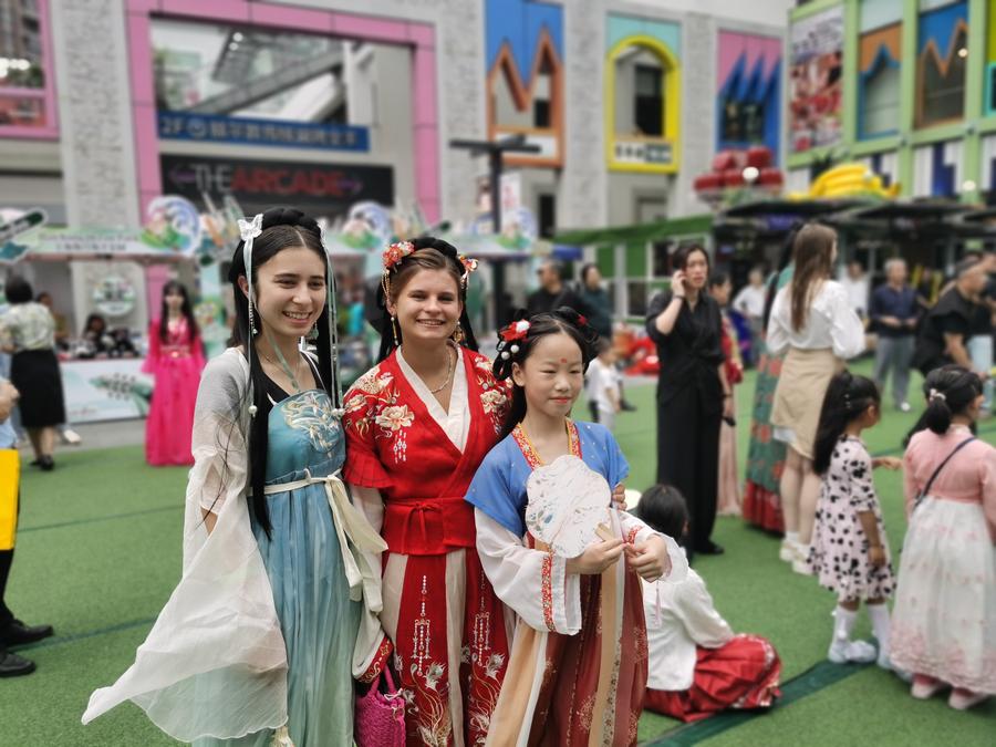 Foreigners and a Chinese girl in traditional Chinese costumes pose for a photo during a Dragon Boat Festival event in east China's Shanghai, June 9, 2024. (Xinhua/Chen Aiping)