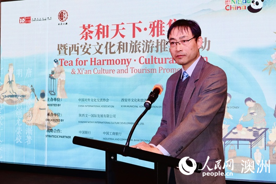 Xiao Xiayong, minister-counsellor of the Chinese Embassy in Australia, speaks at the opening ceremony of Tea for Harmony · Cultural Salon & Xi'an Culture and Tourism Promotion activity in Sydney, July 27, 2024. (Photo/Yuchen Bai)