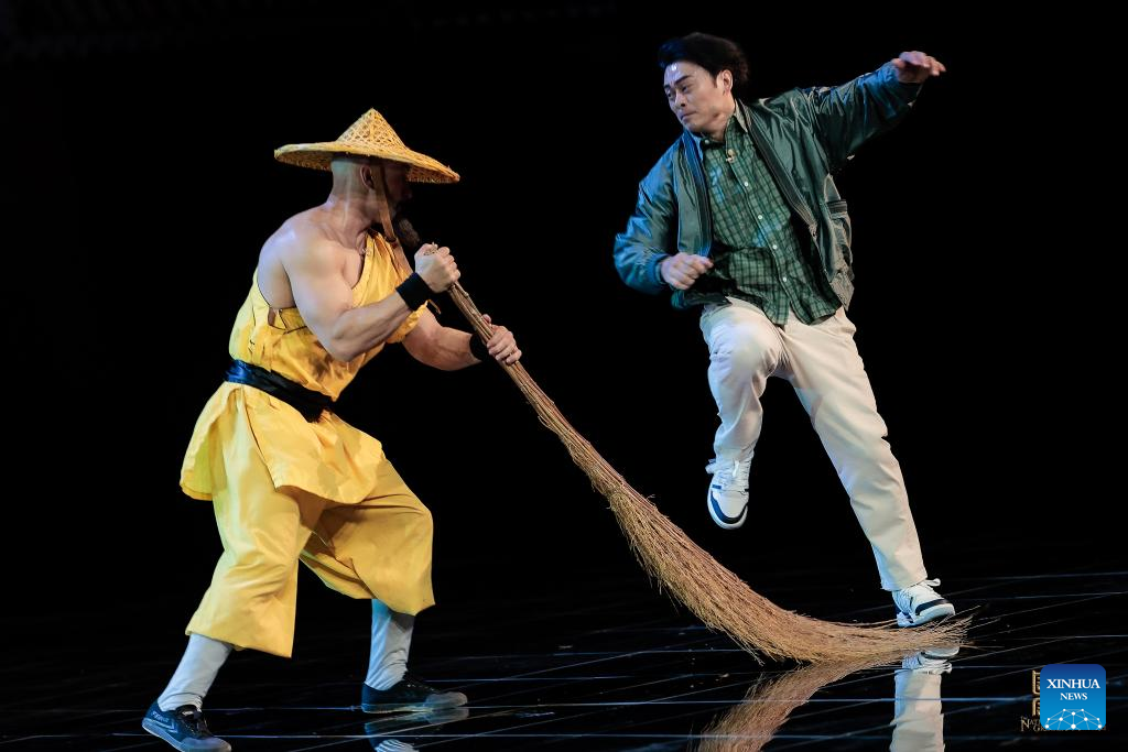 British martial artist Matt Jane (L) and Hong Kong kung fu actor Fan Siu Wong perform during the shooting of an episode of the National Treasure 4 in Beijing, capital of China, April 25, 2024.(National Treasure/Handout via Xinhua)