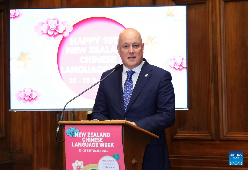 New Zealand Prime Minister Christopher Luxon delivers a speech at the opening reception of New Zealand Chinese Language Week in Wellington, New Zealand, Sept. 23, 2024. The event, running from Sunday to Saturday across New Zealand, includes a variety of activities such as Chinese poetry recitation, Chinese folk music and dance, Chinese film, Chinese food tasting, and Chinese calligraphy workshops. (Photo by Meng Tao/Xinhua)