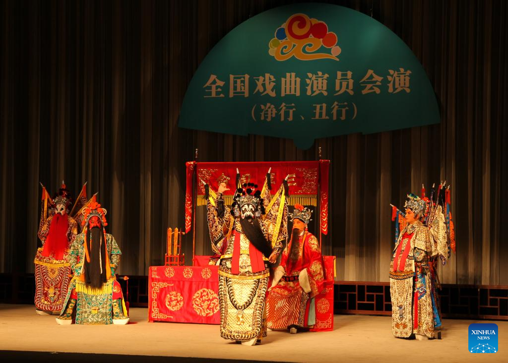 Wang Wei (C), an actor of Liuzi Opera from Shandong Province, performs the role of General Zhang Fei, who is a famous character from the classic Chinese novel "The Romance of the Three Kingdoms," during the annual Chinese Opera Gala (Kunshan) at a Kunqu theater in Kunshan City, east China's Jiangsu Province, Sept. 9, 2024. (Liuzi Opera from Shandong Province/Handout via Xinhua)