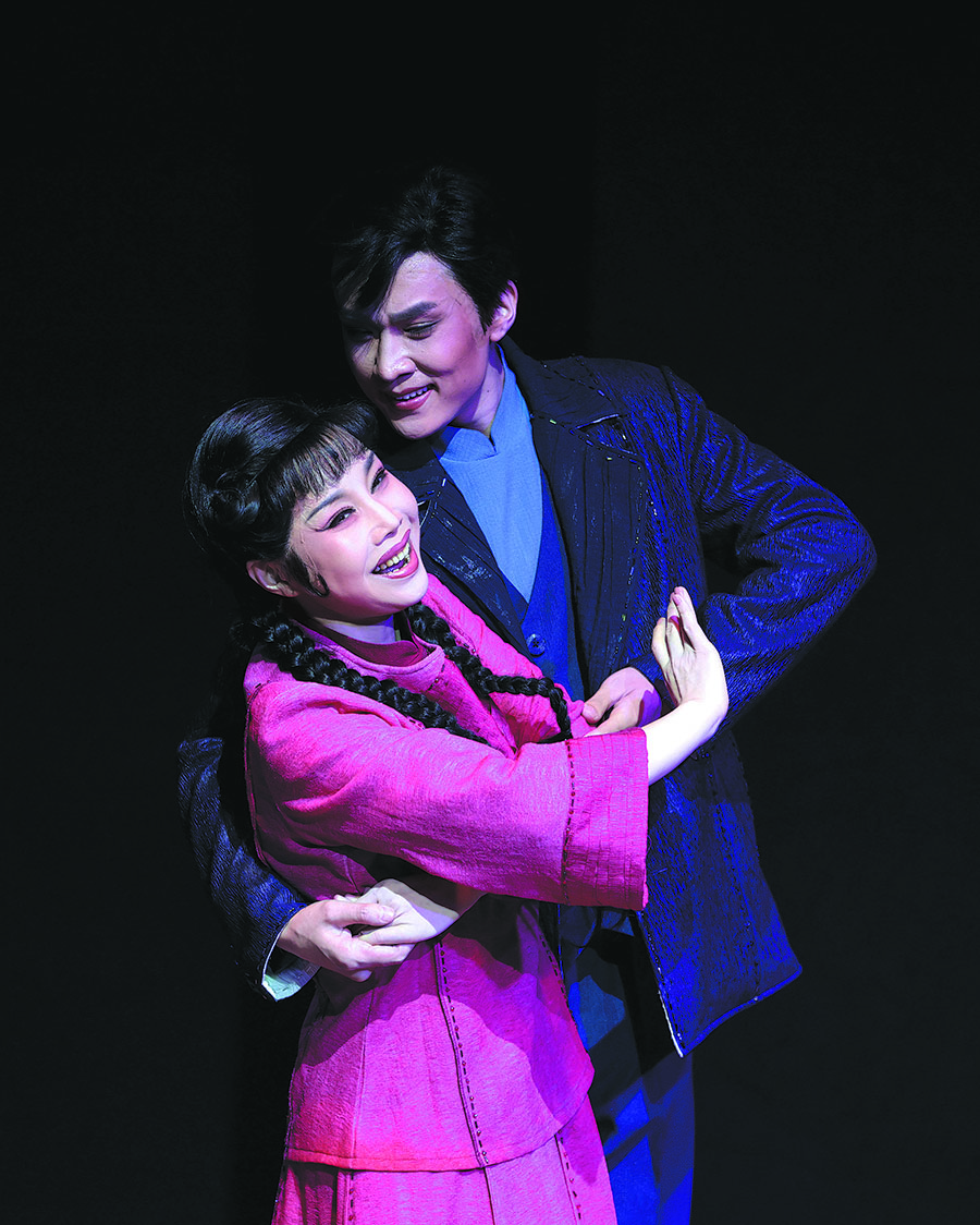 "It's a challenge for us to tell a romantic story with Yuju Opera, and it's also very hard for me to play the role," says Zhang, adding that Yuju Opera performers emphasize physical expression and movement, using gestures, facial expressions, and body language to convey narrative. "I used two different singing styles to interpret the role.Huadanis a specific role reserved for lively and youthful women characters. The vocal style used for singing this role is also bright and lively and requires a clear, high-pitched voice. I used it to portray Qiu as she falls in love. When her life becomes miserable after she is abandoned, I turned to theqingyirole, which is usually used to depict mature, elegant and reserved women, and sang with a more controlled voice to express deeper emotion.