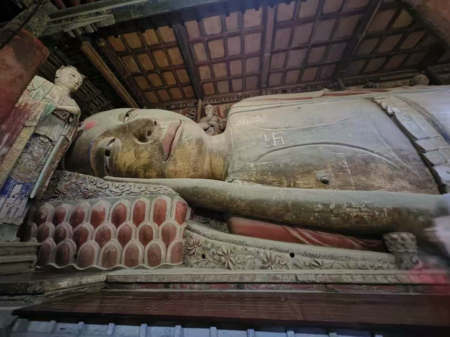 Measuring some 35 meters long, the gigantic statue is made of clay on a wooden frame, depicting the Gautama Buddha's attainment of nirvana, with his ten disciples standing behind him.Also on view in the hall displayingthe statue are murals dating back to the Qing Dynasty (1644-1911) which depict stories of the Silk Road.