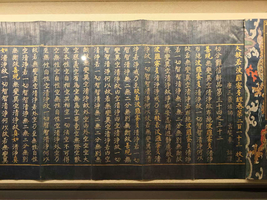 Part of the ancient scriptures written with gold ink displayed at Zhangye Dafo Temple in Northwest China’s Gansu province. [Photo by Yang Xiaoyu/chinadaily.com.cn]