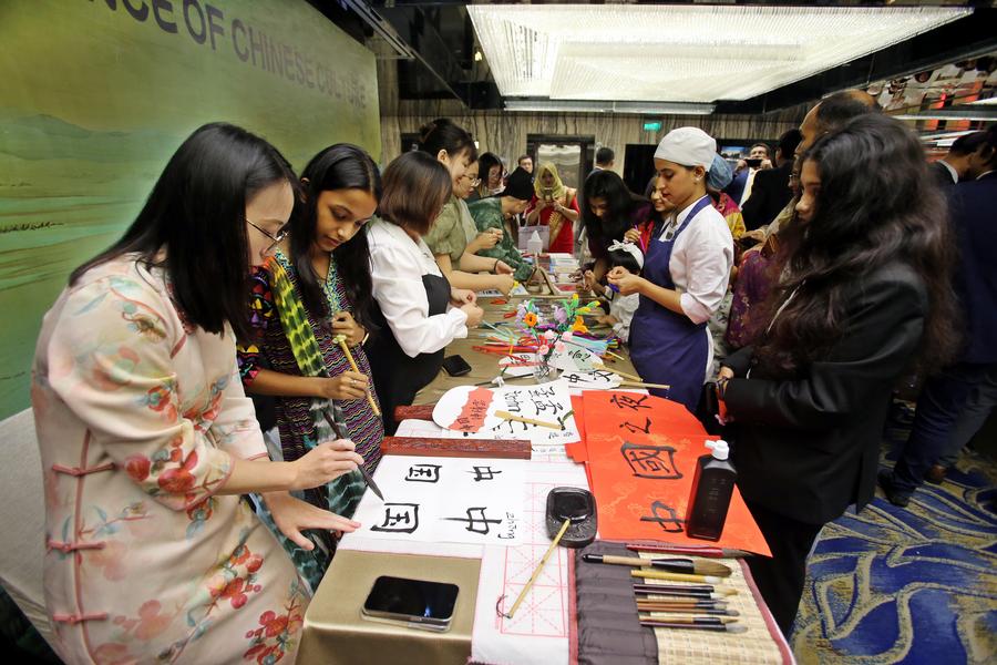 People take part in cultural activities during the "Chinese Culture Night" event in Dhaka, Bangladesh on Nov. 22, 2024. (Xinhua)