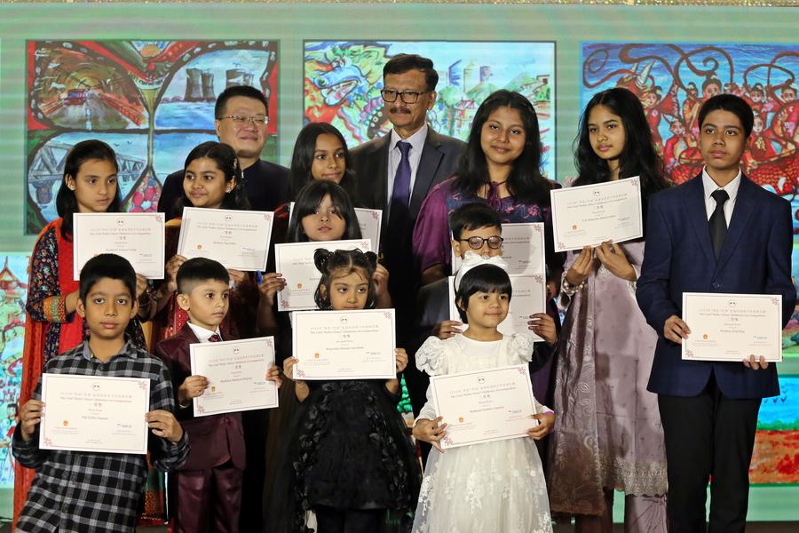 Chinese Ambassador to Bangladesh Yao Wen (L, back row) and Foreign Advisor to the Bangladeshi Interim Government Md. Touhid Hossain (R, back row) attend the award ceremony of the "Hello, China!" Bangladesh Children Art Competition during the "Chinese Culture Night" event in Dhaka, Bangladesh on Nov. 22, 2024. (Xinhua)