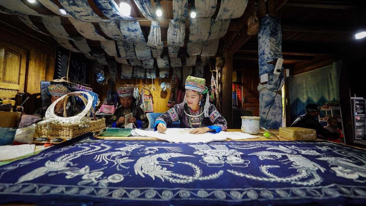 In recent years, Rongjiang county in Qiandongnan Miao and Dong autonomous prefecture of Guizhou province has transformed traditional crafts like batik and embroidery into sought-after fashion items by combining intangible cultural heritage with creative design. Photo shows local Miao women making batik products. (People's Daily Online/Zhou Guangsheng)