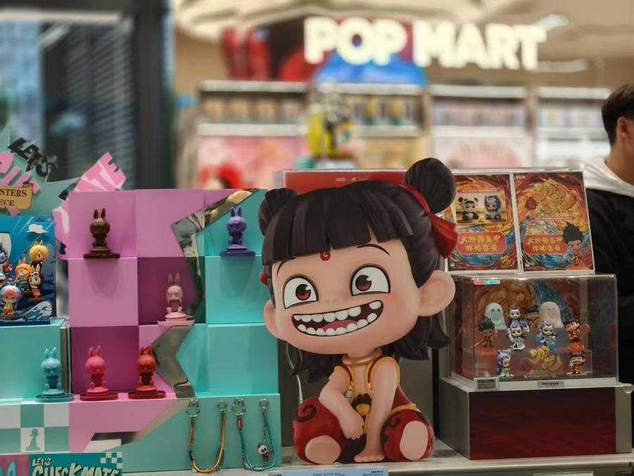 Cultural creative products of Chinese animated film Ne Zha 2 are pictured in a toy store in Chengdu, southwest China's Sichuan Province, March 4, 2025. (Xinhua/Lu Youyi)
