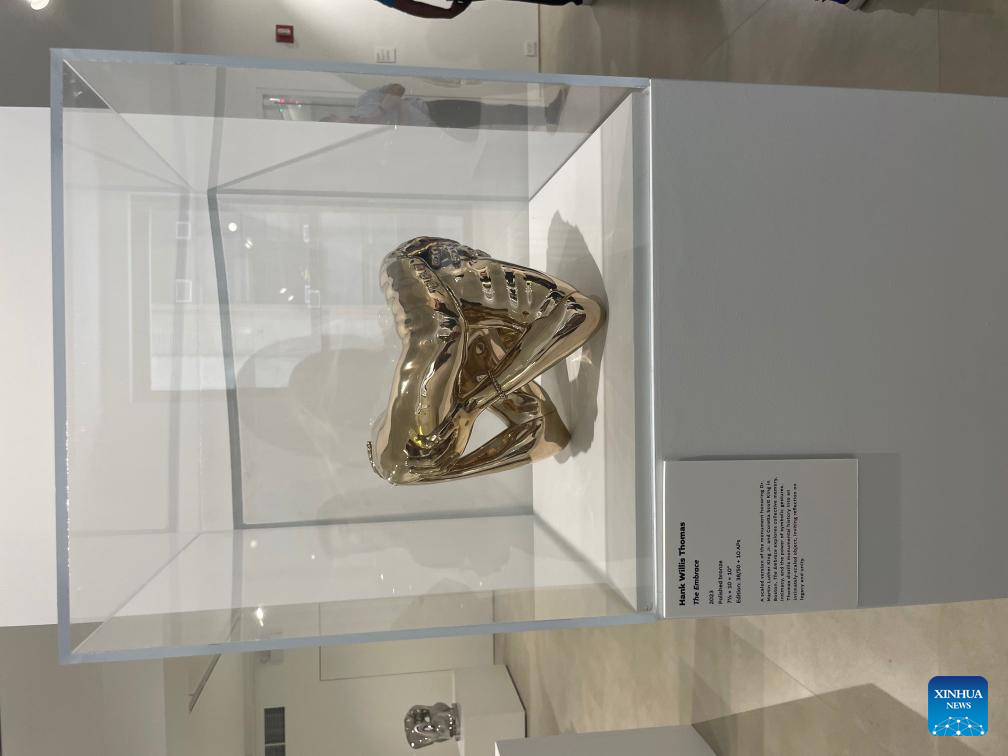American conceptual artist Hank Willis Thomas' work The Embrace is displayed during a joint exhibition titled People Everyday in New York, the United States, on May 20, 2025. A collection of art works by renowned Chinese sculptor Liu Shiming and American conceptual artist Hank Willis Thomas was previewed Tuesday at the Liu Shiming Art Gallery in midtown New York City. (Photo by Sabrina Zhang/Xinhua)
