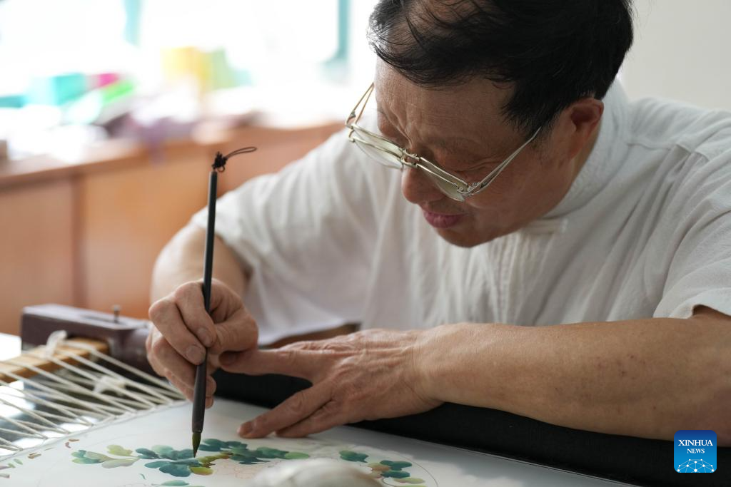 Chen Boyu draws patterns at the Jiali hair embroidery factory in Dongtai City, Yancheng of east China's Jiangsu Province, June 6, 2025. (Xinhua/Xue Yuge)